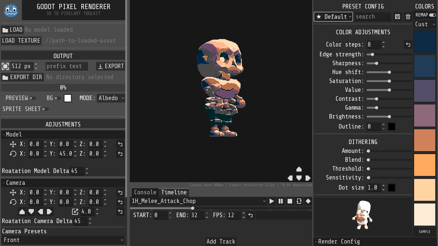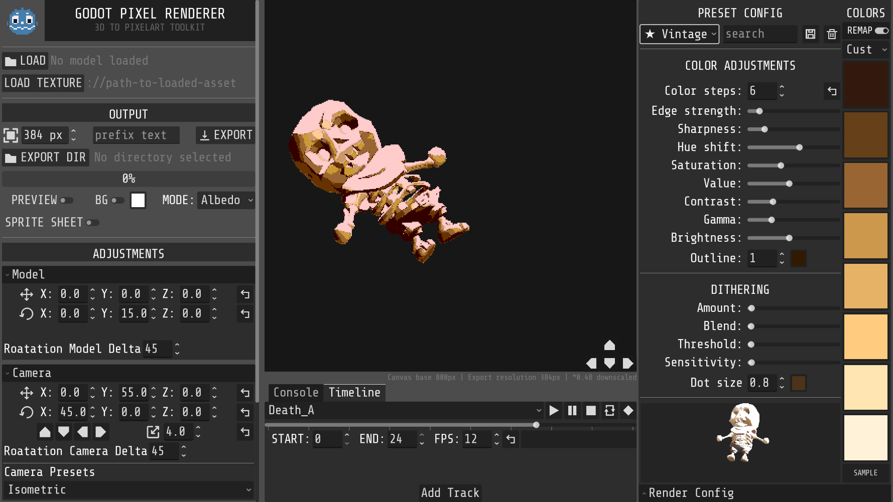 Retro Forge is a tool for Godot 4.5+ that turns your 3D models and animations into pixel art in real time. Create retro-style sprites with customizable effects, export frames or sprite sheets, and control animations using timelines and tracks.